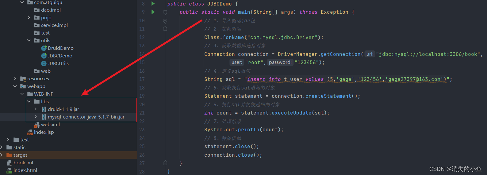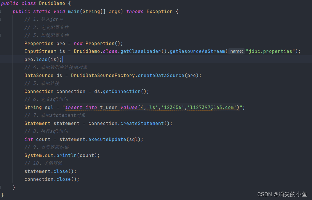 以上,为使用druid连接池连接数据库后进行插入操作。修改,删除,查询操作请参考jdbc连接数据库。