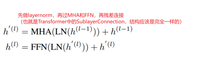 基本基于MultiHeadAttention,但是把Layernorm改在MultiHeadAttention和FeedForwardNetwork之前而不是之后