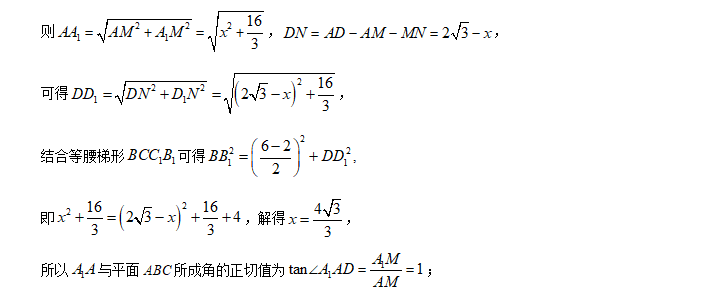 解:正三棱台的上下底面为正三角形,由正三角形的面积公式 \(S_{正\triangle}=\cfrac{\sqrt{3}}{4}a^2\),其中 \(a\) 为正三角形的边长,则由 \(\cfrac{\sqrt{3}}{4}a^2=\sqrt{3}\) 或 \(\cfrac{\sqrt{3}}{4}a^2=4\sqrt{3}\) ,可得上下底的边长分别为 \(2\) 和 \(4\),即 \(BC=2\),\(B_1C_1=4\),设上下底面的中心分别为点 \(O\) 和 \(O_1\),则 \(AD\) 和 \(A_1D_1\) 分别是上下底三角形的高线,连结 \(DD_1\),则 \(DD_1\) 是正三棱台的斜高,过点 \(D\) 作 \(DE\perp A_1D_1\) 于点 \(E\),则 \(D_1E\) 是斜高 \(DD_1\) 的投影;