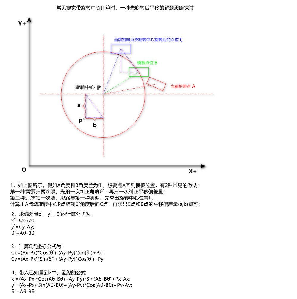 1,计算变得复杂起来,由上图可知从当前拍照位置回到模板位置的其差值x`、y`、θ`为: