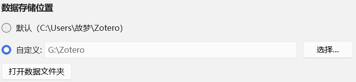 如下图所示,数据默认存储在了 C:\Users\故梦\Zotero 里,将该文件夹拷贝出来,放到其他位置,我这里放到了 G 盘下,之后选择自定义文件夹。