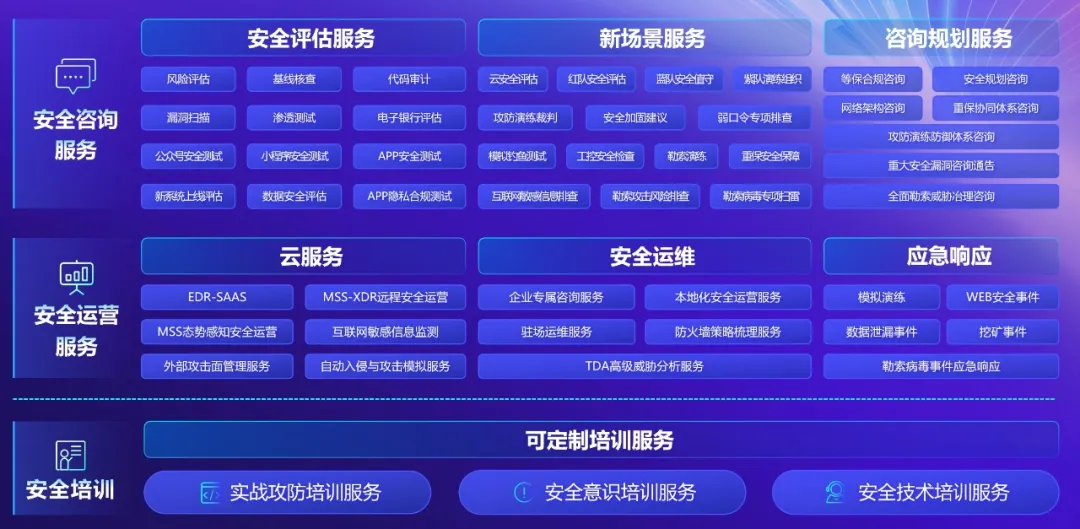 亚信安全成立于2014年,深耕于网络安全软件领域。在2015年推出以能力建设为中心的新一代网络安全服务体系,服务类型主要分为安全评估服务、新场景服务、咨询规划服务、云服务、安全运维服务、应急响应服务、可定制培训服务七大类,灵活适配网络安全服务需求。目前已广泛服务于金融、电力、企业客户、政府/公共事业单位、电信运营商等多个行业领域。