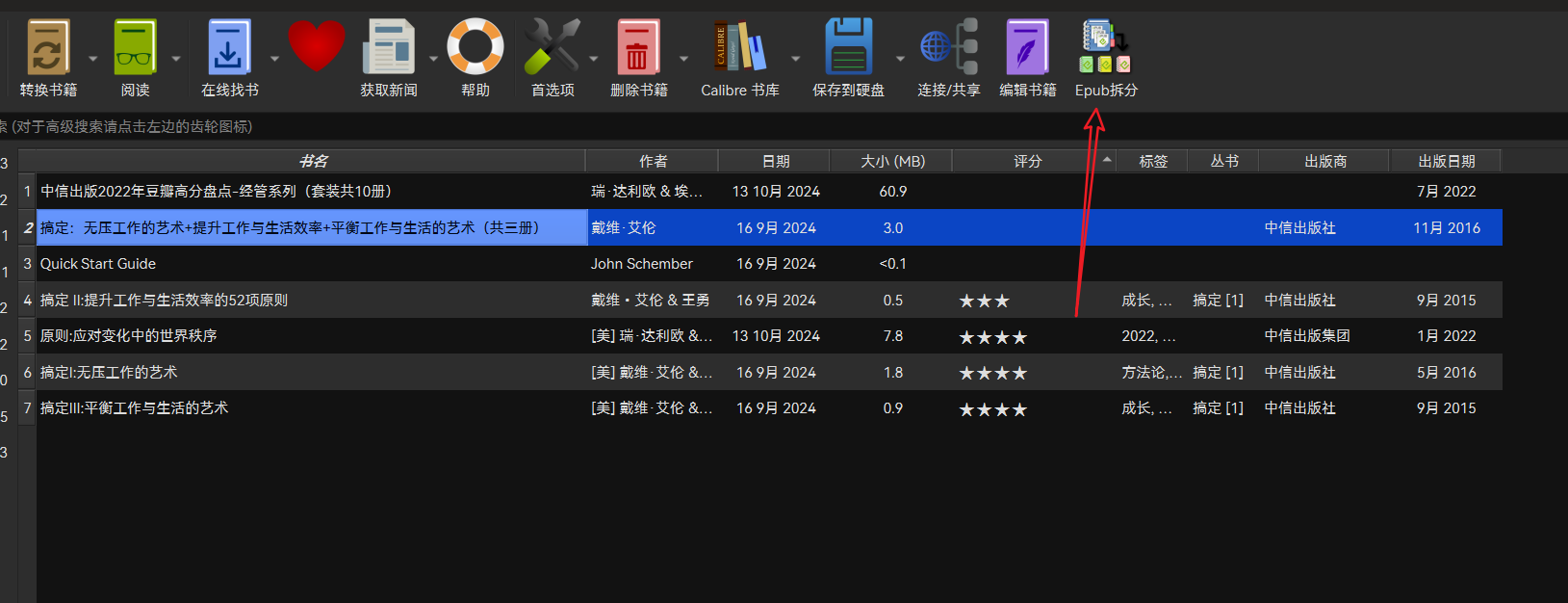 首先用 EpubSplit 分割电子书合集。安装完 EpubSplit 后,界面中会有一个 Epub 拆分的按钮。选中要分割的电子书,然后点击 Epub 拆分按钮。