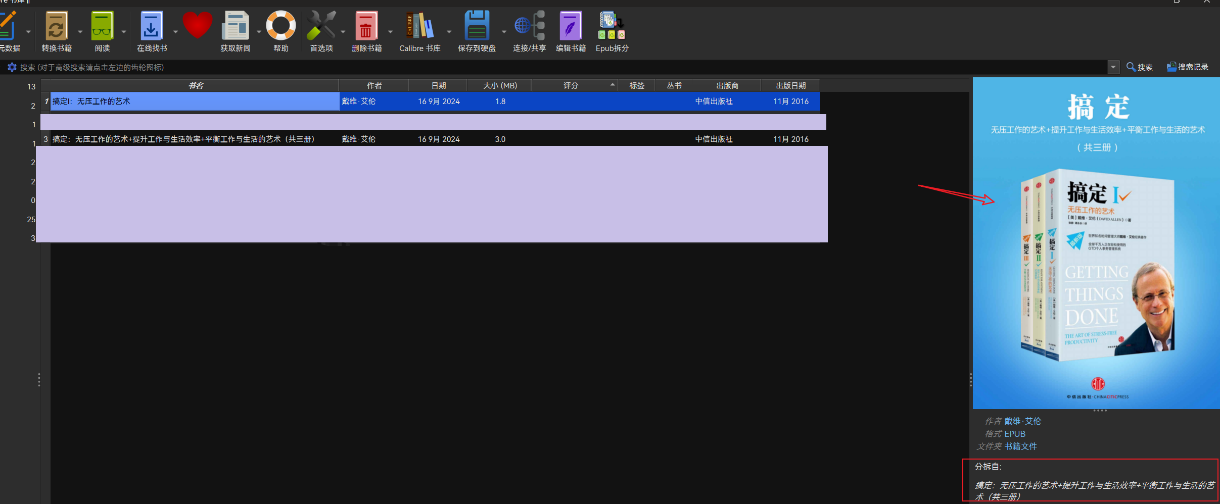 然后我们看,界面中出现了一本电子书,它右侧的元数据中封面与合集一样,并且会写“拆分自:xxxxxxxx”。这样这本书就拆分出来了。接下来我们要修改它的元数据和目录。