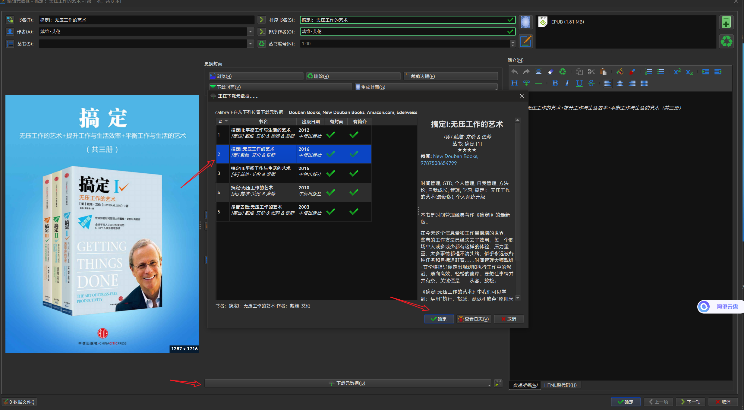 再点击下方的“下载元数据”按钮,插件会自动根据现有的元数据去匹配完整的元数据。受网络影响,一些 google、Amazon 的插件可能搜索不到,New Douban Books 可以搜索到完整的元数据。等待几秒钟,出现结果后选中相应的数据,再点击确定即可。同样,还会出现搜索封面的结果,同样选择正确的封面并点击确认即可。