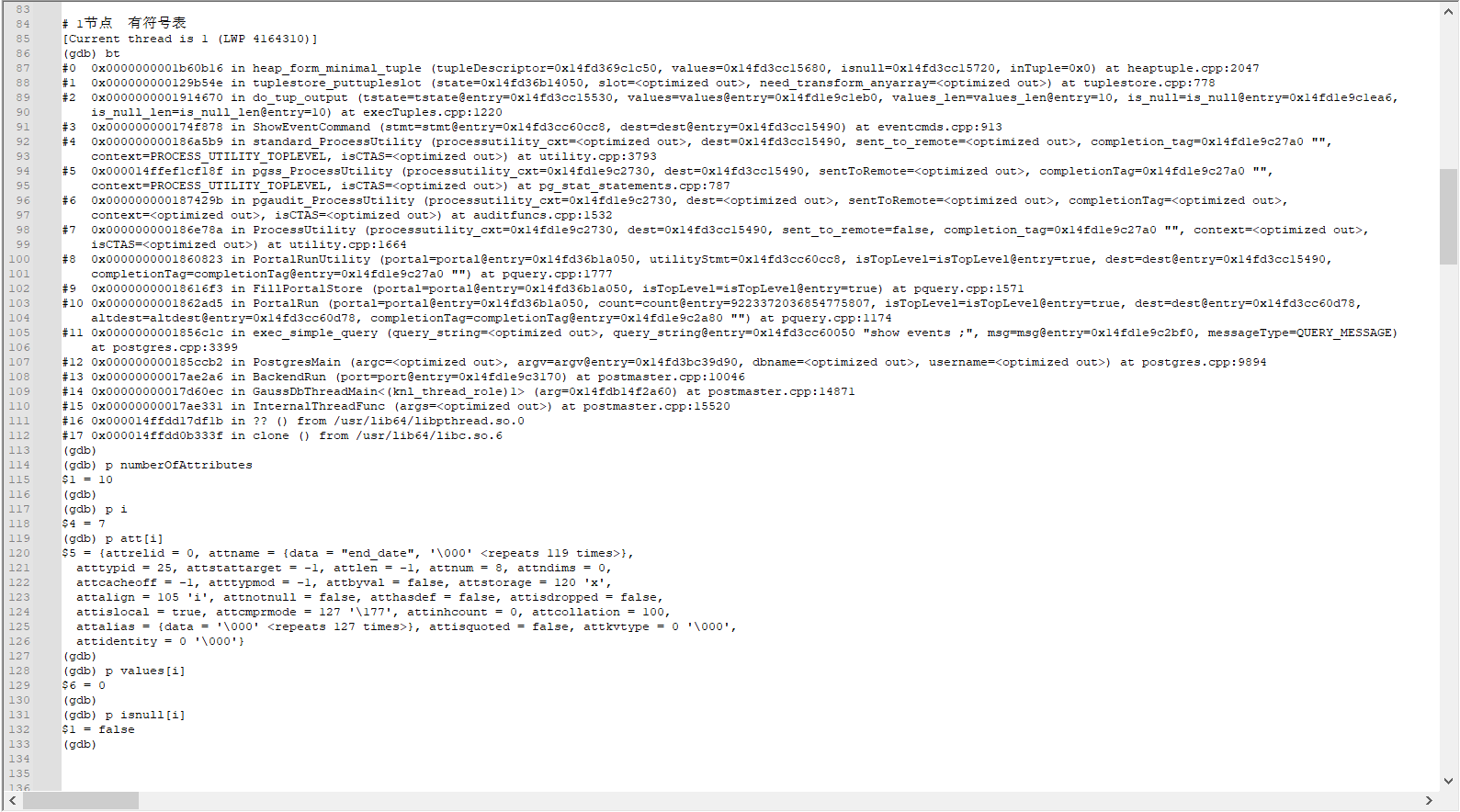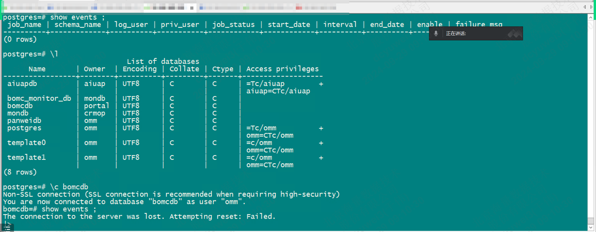 gsql -r show events; \c bomcdb; -------- 业务库名称 show events; -------- database coredump