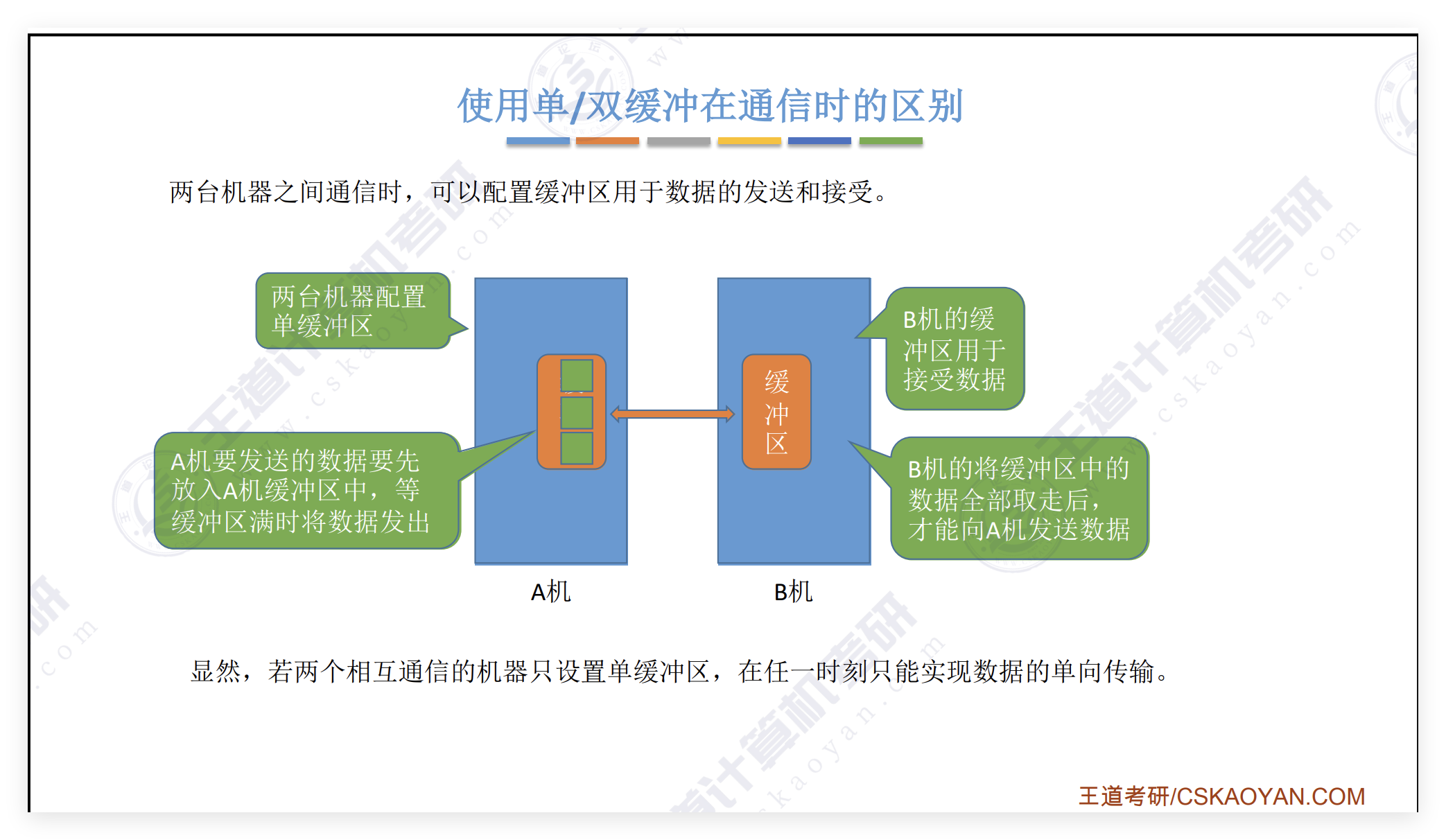 双缓冲区可以进行全双工通信,单缓冲区只能进行半双工通信,但是要注意半双工通信也是双向的,如果题目只是笼统地说双向通信,则一定要小心