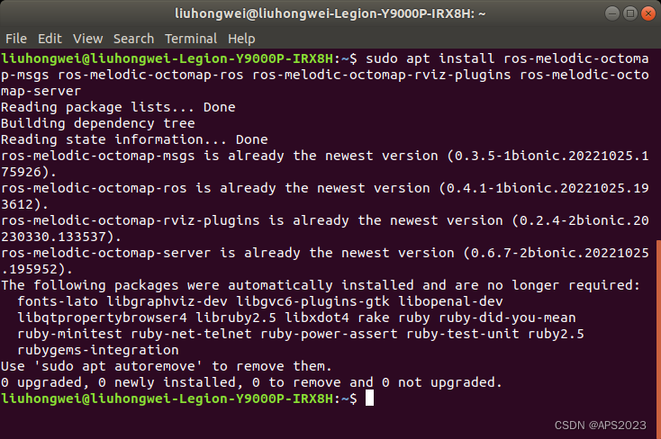 sudo apt install ros-melodic-octomap-msgs ros-melodic-octomap-ros ros-melodic-octomap-rviz-plugins ros-melodic-octomap-server