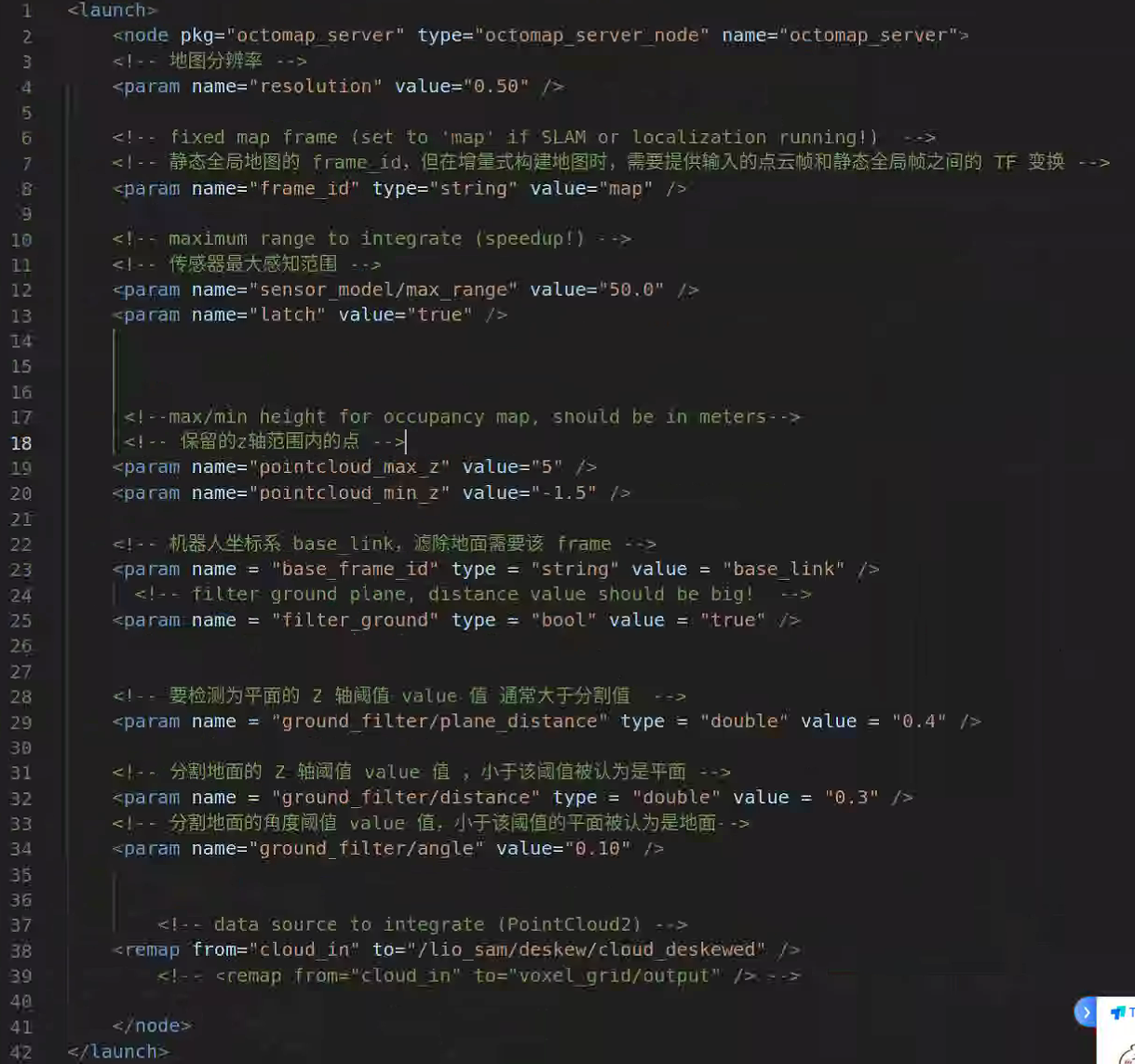 在lio sam中,/odom需要remap为/lio_sam/mapping/odometry, /scan需要remap成pointcloud_to_laserscan发布的/base_scan /map则不需要变,对应的整体参数如下:参数用默认的yaml文件即可,也可根据需要自行调整。