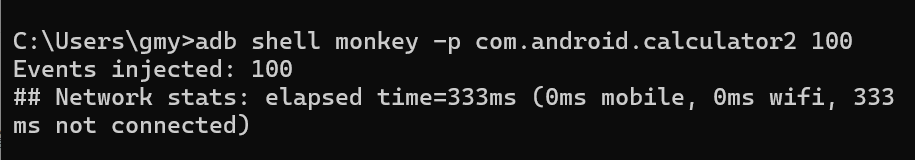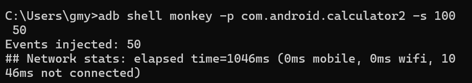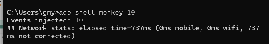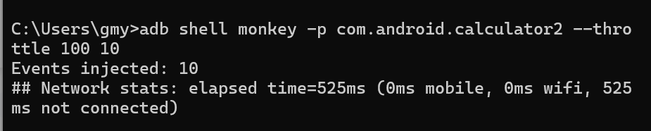 格式为adb shell monkey -p {package} --throttle {间隔时间} {事件数}
