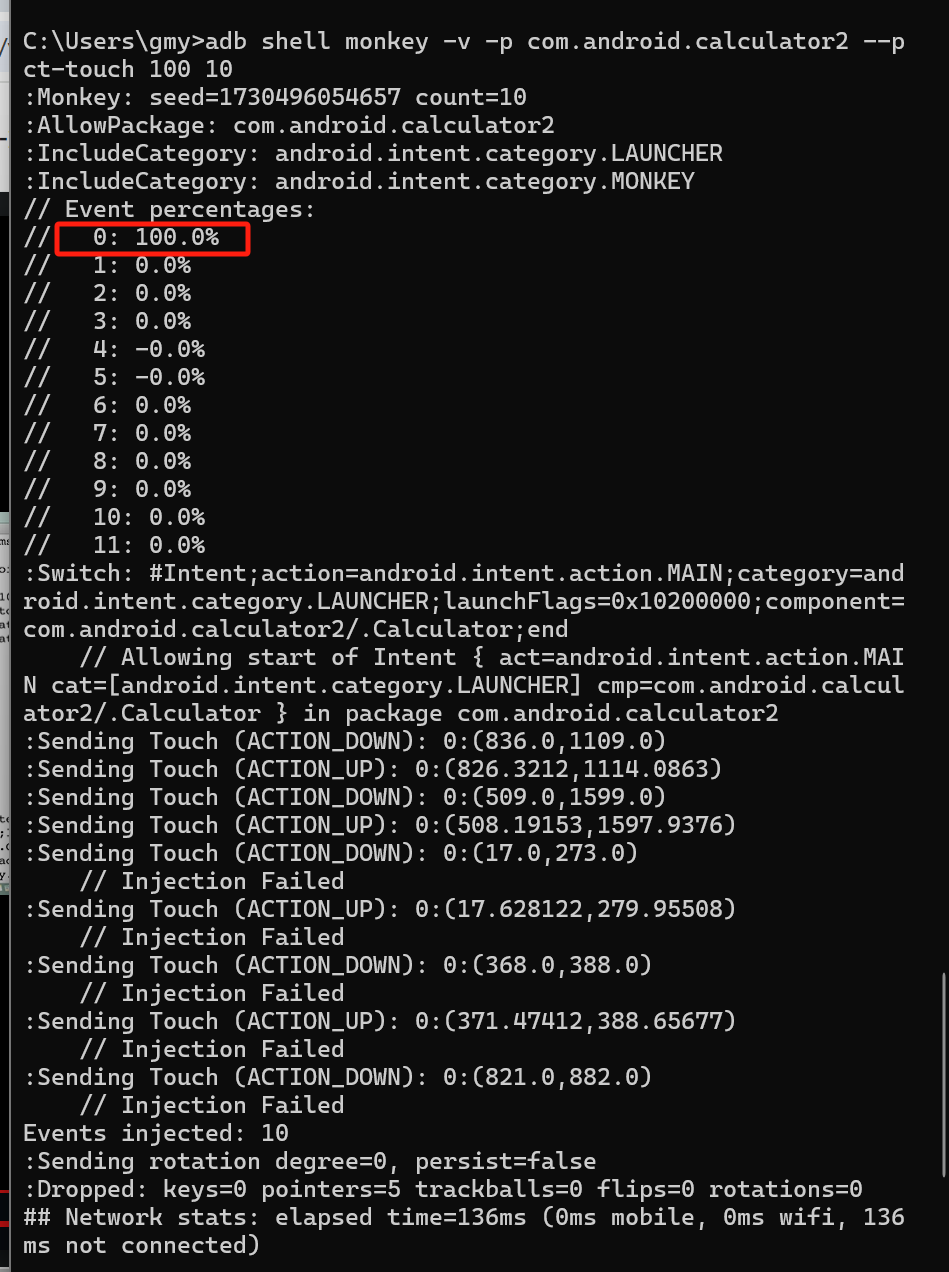 adb shell monkey -v -p {package} --pct-anyevent {百分比} {事件数}