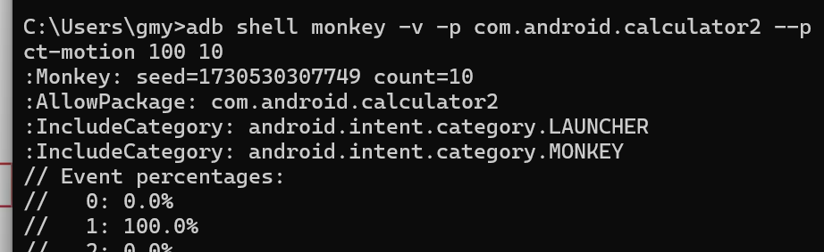 设置动作事件百分比 adb shell monkey -v -p {package} --pct-motion {百分比} {事件数}