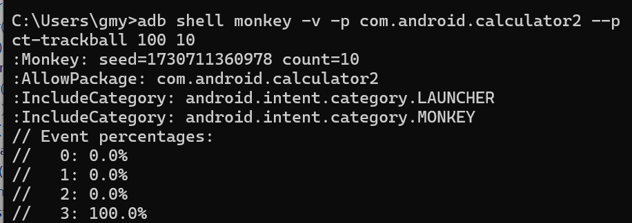 adb shell monkey -v -p {package} --pct-trackball {百分比} {事件数}
