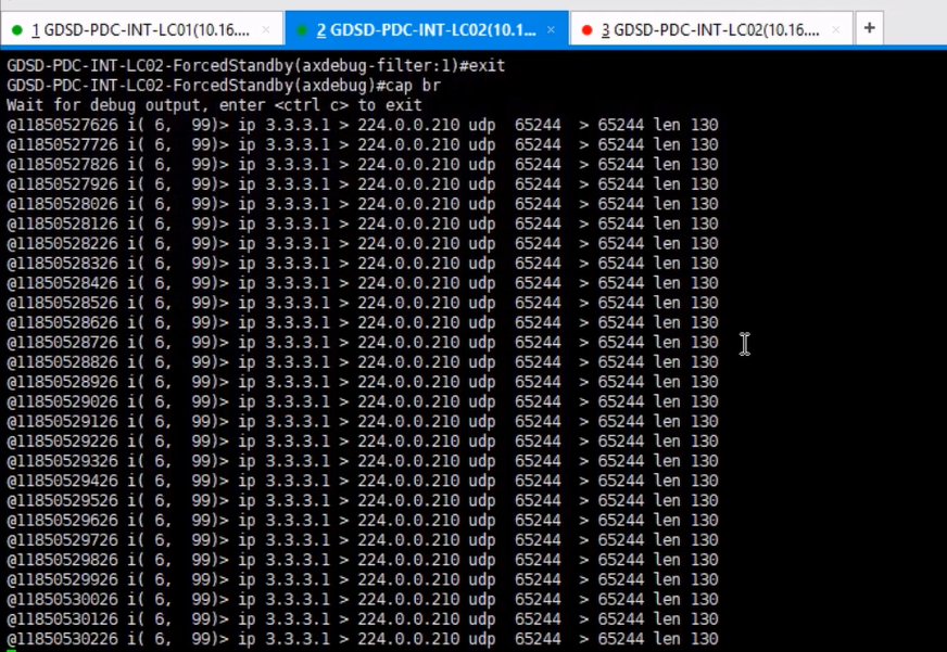 结果发现,LC01可以通过port5和port6发出包,但LC02只有port6收到了包,任何通过port5的包都被丢弃了。