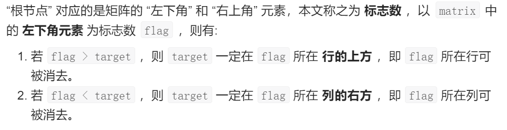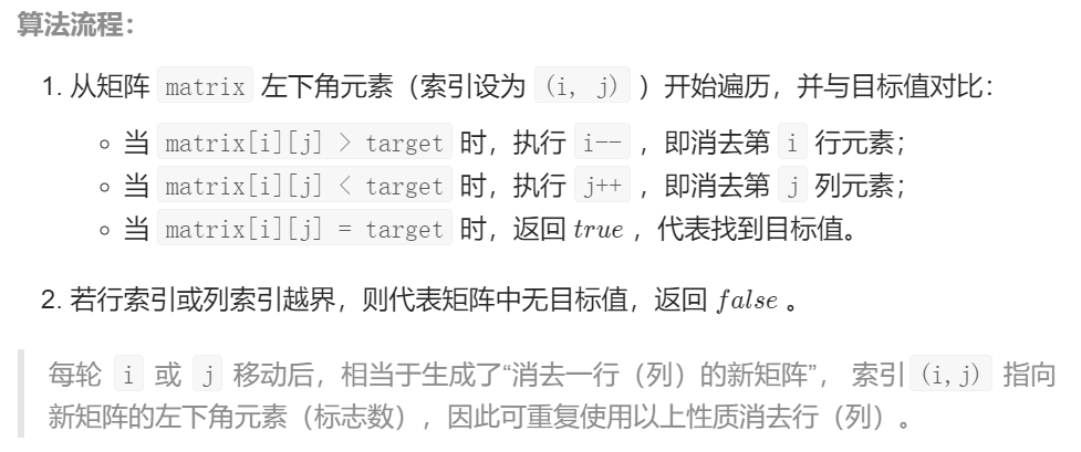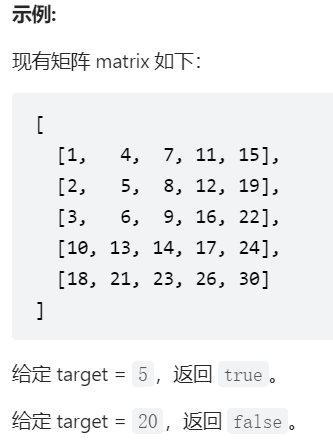 class Solution{ public boolean findNumberIn2DArray(int matrix[][],int target){ int i = matrix.length-1,j=0; while(i>=0&&j<matrix[0].length){//注意i,j的长度 if(matrix[i][j]>target) i--; else if (matrix[i][j]<target) j++; else return true; } return false; } }