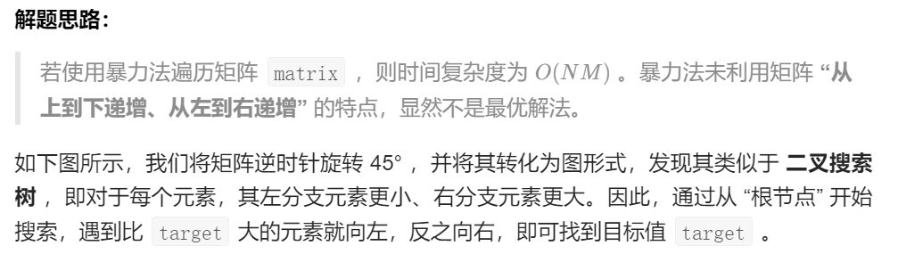 时间复杂度 O(M+N) :其中,N 和 M 分别为矩阵行数和列数,此算法最多循环 M+N 次。