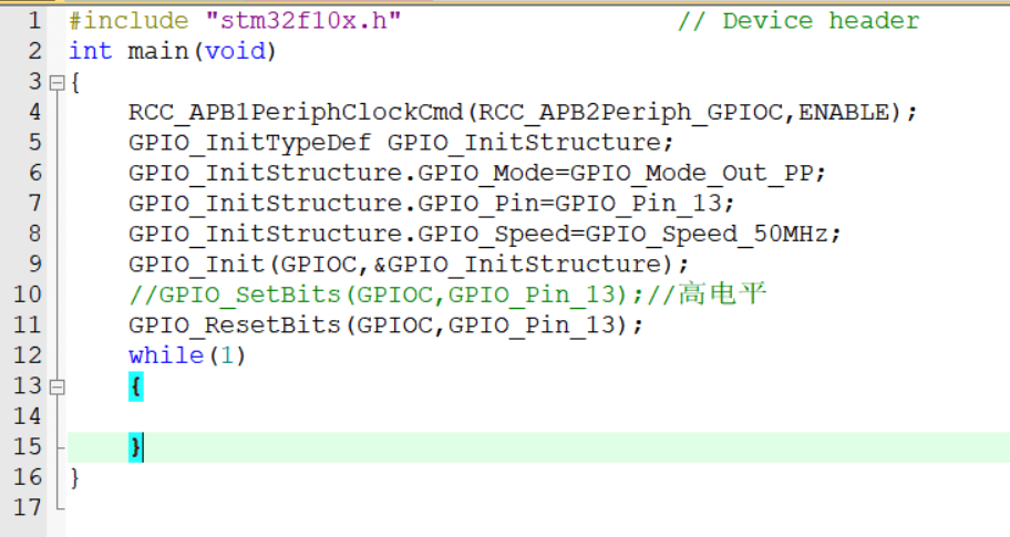 GPIO_ResetBits(GPIOC,GPIO_Pin_13);//引脚低电平设置