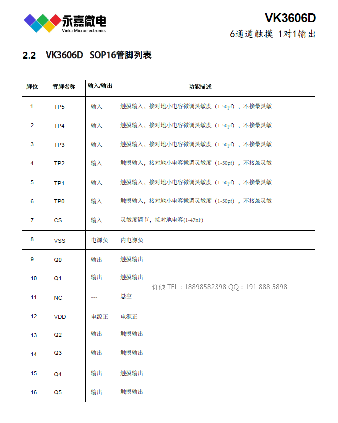 VK3606D 工作电压/待机电流:2.4V-5.5V/7μA(3V) 感应通道数:6 输出方式:直接输出