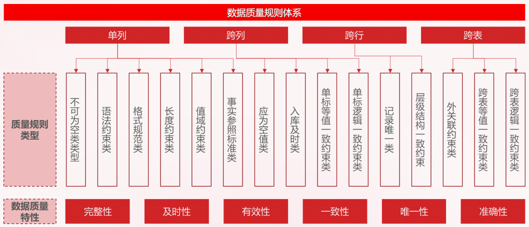 (4)一致性:遵循统一的数据标准,记录和传递数据和信息(系统间主外键校验)。例:张三的身份证号在A系统和B系统是一致的。