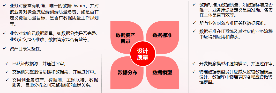 设计质量为数据架构落地情况,从数据责任人、数据标准、数据模型、数据分布四个方面检查各业务领域、应用系统的数据架构遵从、准备度、落地情况。