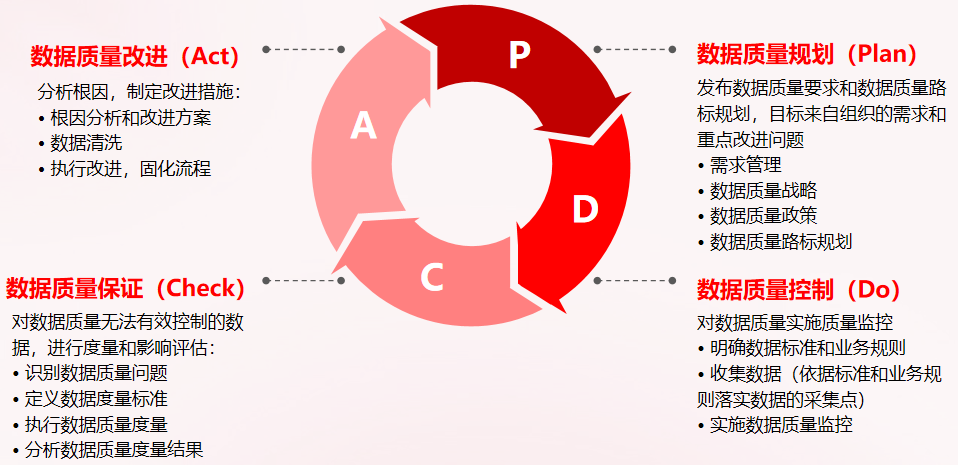 华为以ISO8000质量标准体系为依据,设计能力支撑、PDCA持续改进和领导力3个组件的数据质量管理架构。