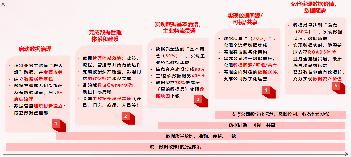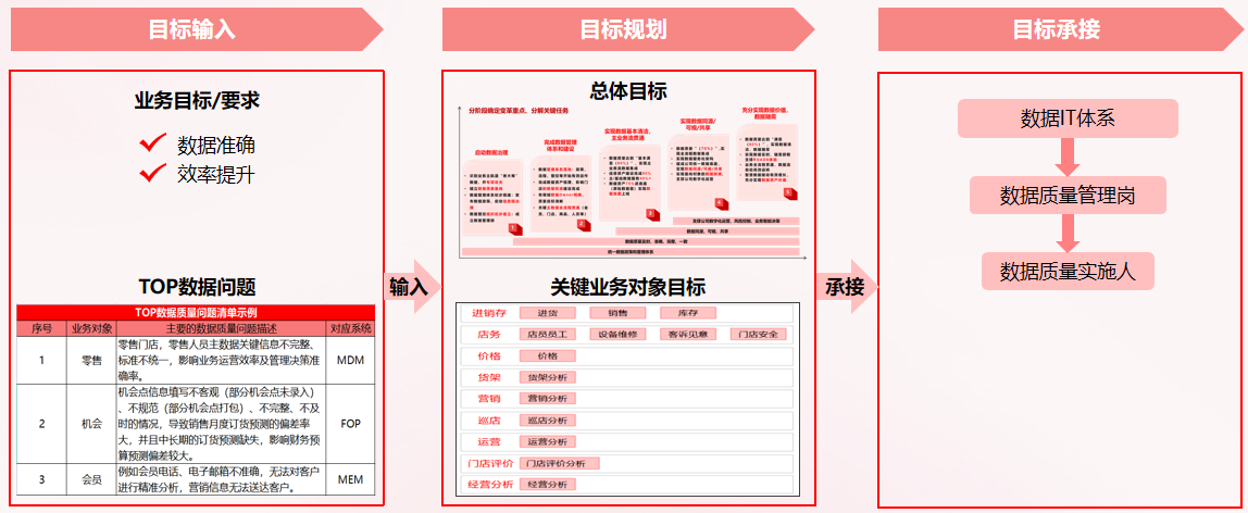 基于业务目标和TOP数据问题,识别数据目标,层层分解,由数据Owner承接改进的责任,并对目标的达标负责。