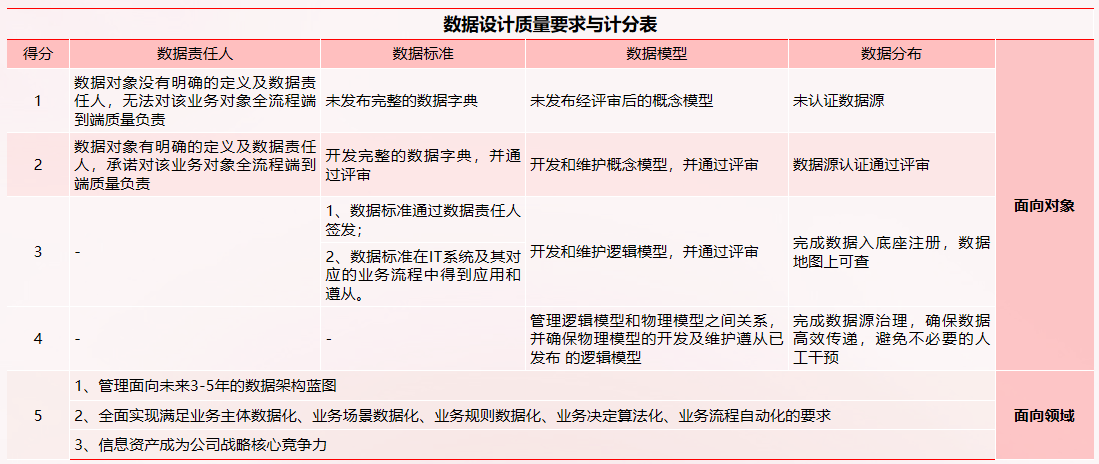 设计质量:对多个流程域所有业务对象的数据架构建设情况进行评估