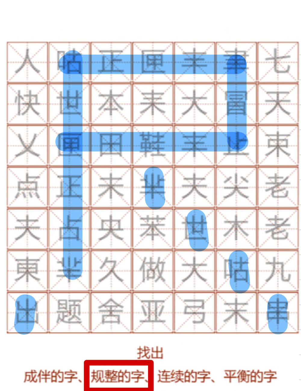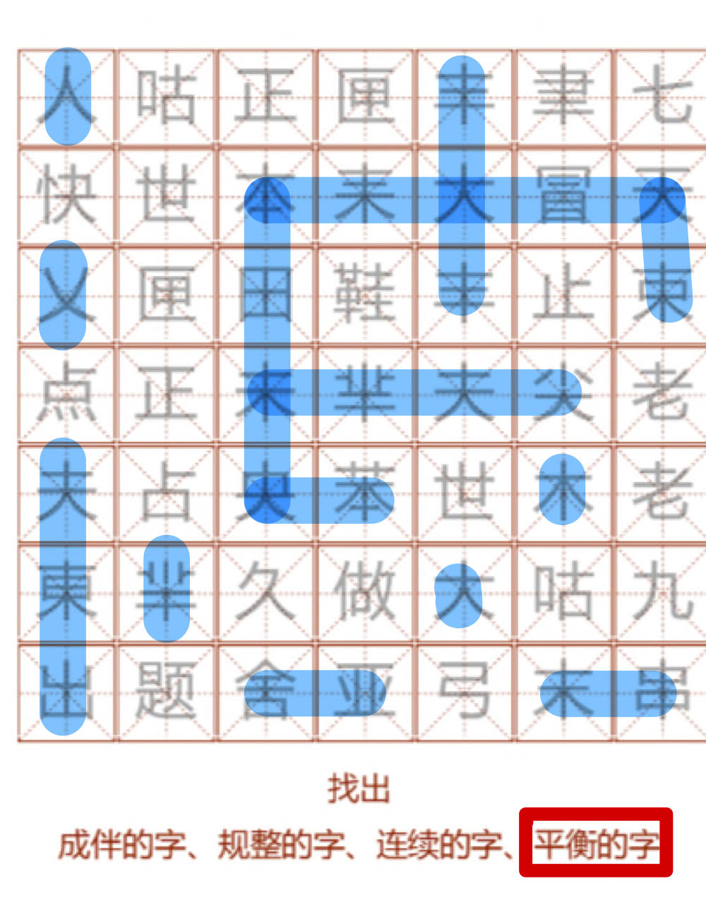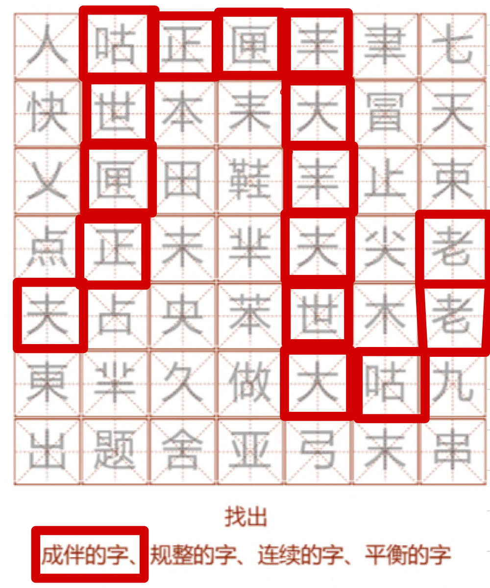 也是一道相对来说简单(但是费眼睛)的题目。题干中给的提示是“不认识汉字也能做”。事实上汉字可以有几个部分来描述,了解组成汉字的部分对解出这个区域的谜题来说很重要:读音、笔画(顺序)、字形(偏旁)等。不认识汉字的人对汉字的理解,只能停留在字形部分,所以需要从字形入手。