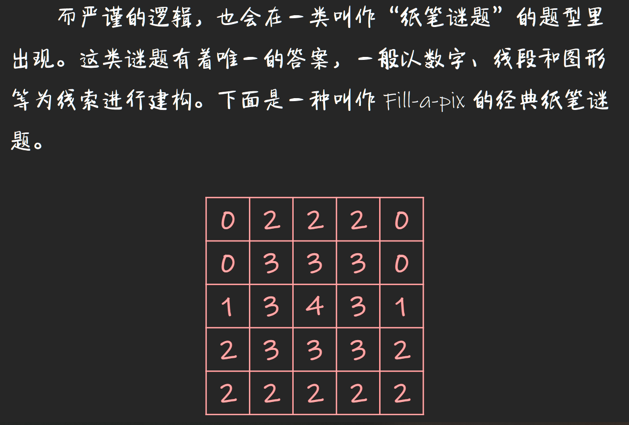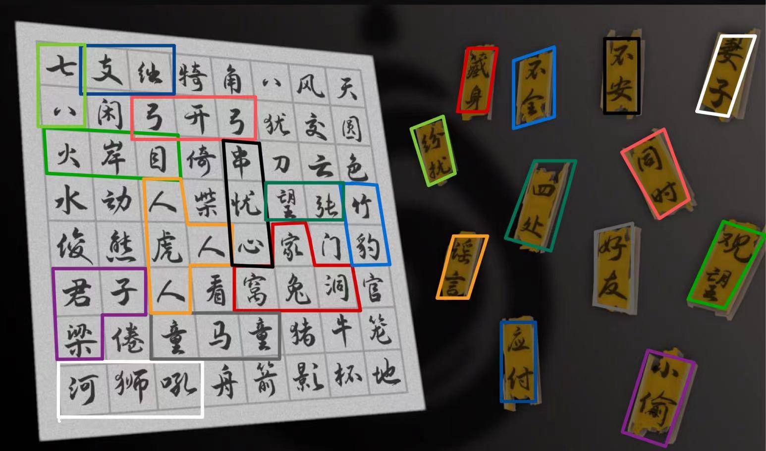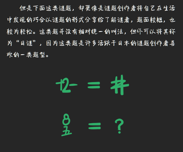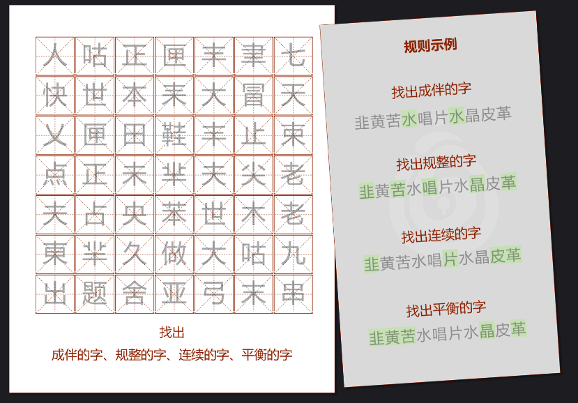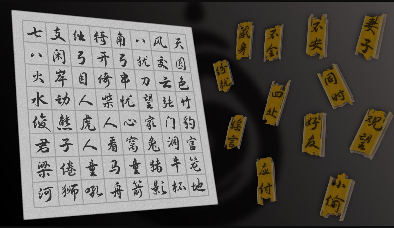 也是一道相对来说简单(但是费眼睛)的题目。题干中给的提示是“不认识汉字也能做”。事实上汉字可以有几个部分来描述,了解组成汉字的部分对解出这个区域的谜题来说很重要:读音、笔画(顺序)、字形(偏旁)等。不认识汉字的人对汉字的理解,只能停留在字形部分,所以需要从字形入手。