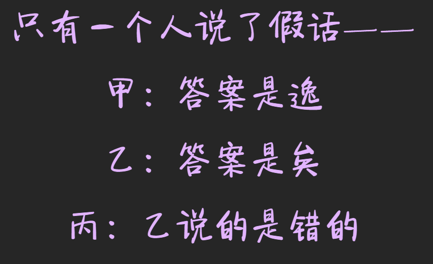 公务员考试题,只有一个人说了假话,则有两人说了真话,甲乙相反,所以丙说的一定是对的,那么甲是对的,所以答案是“逸”