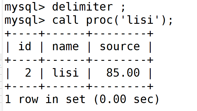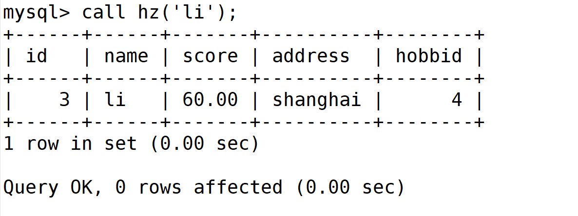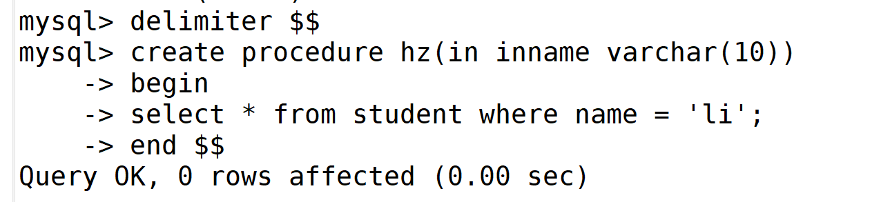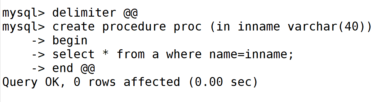 create procedure ee(in inname varchar(16)) #创建存储过程,过程名自定义,()可带参数