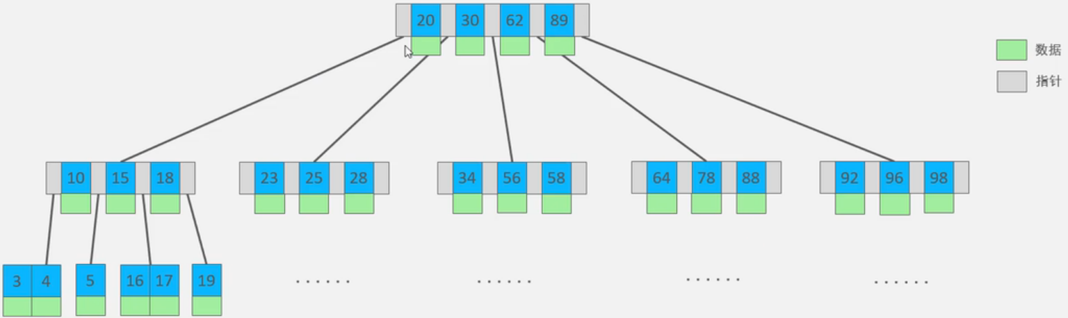 以一颗最大度数(max-degree)为5(5阶)的b-tree为例(每个节点最多存储4个key,5个指针):