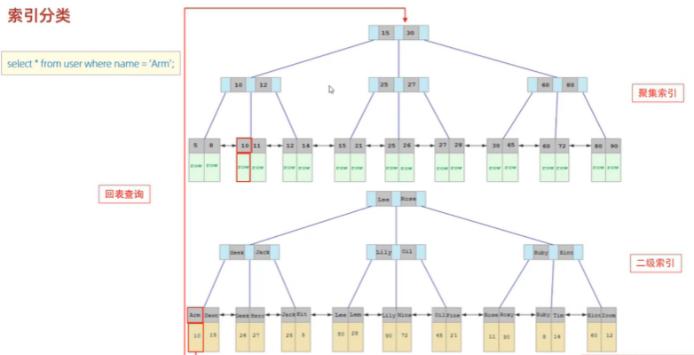 select * from user where id = 10; --查id的效率高,因为查name的要先查出id,再回表查询row