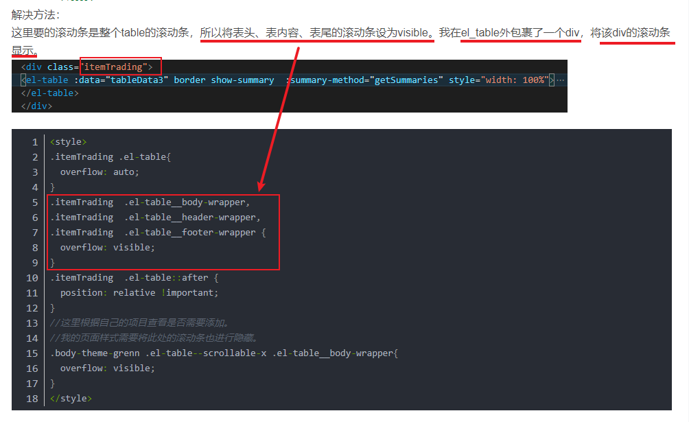 <style> .itemTrading .el-table{ overflow: auto; } .itemTrading .el-table__body-wrapper, .itemTrading .el-table__header-wrapper, .itemTrading .el-table__footer-wrapper { overflow: visible; } .itemTrading .el-table::after { position: relative !important; } //这里根据自己的项目查看是否需要添加。 //我的页面样式需要将此处的滚动条也进行隐藏。 .body-theme-grenn .el-table--scrollable-x .el-table__body-wrapper{ overflow: visible; } </style>