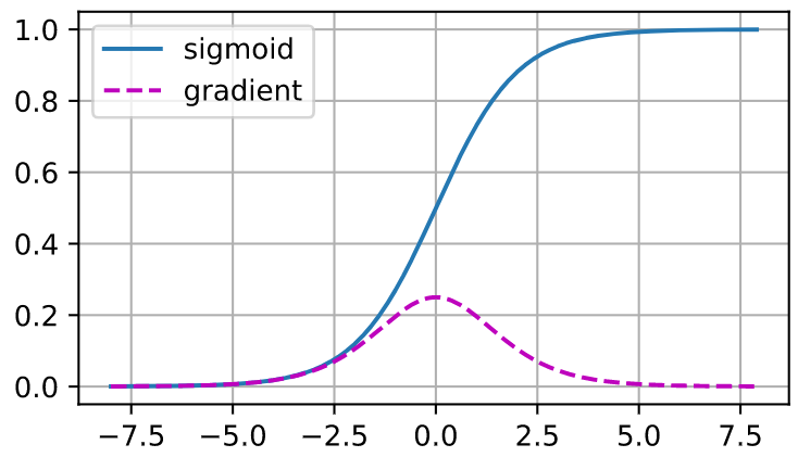 可以看到,当输入大于5或小于-5的时候,sigmoid函数的梯度几乎为0.