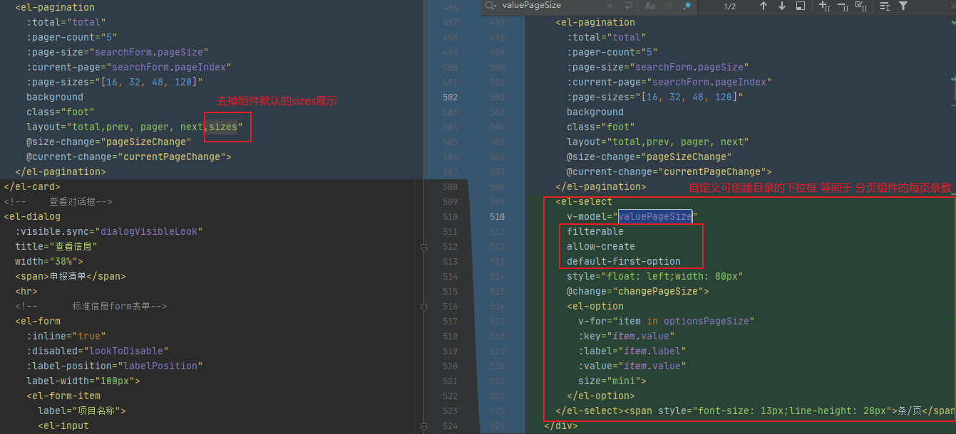 <div style="display: flex;"> <el-pagination :total="total" :pager-count="5" :page-size="searchForm.pageSize" :current-page="searchForm.pageIndex" :page-sizes="[16, 32, 48, 120]" background class="foot" layout="total,prev, pager, next" @size-change="pageSizeChange" @current-change="currentPageChange"> </el-pagination> <el-select v-model="valuePageSize" filterable allow-create default-first-option style="float: left;width: 80px" @change="changePageSize"> <el-option v-for="item in optionsPageSize" :key="item.value" :label="item.label" :value="item.value" size="mini"> </el-option> </el-select><span style="font-size: 13px;line-height: 28px">条/页</span> </div>