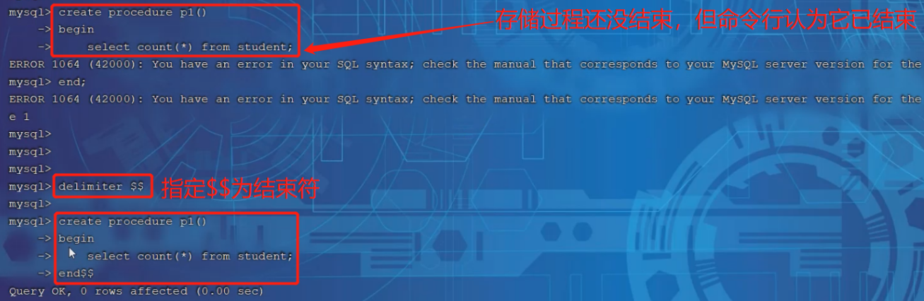 在命令行中,执行创建存储过程的SQL时,需要通过关键字delimiter指定SQL语句的结束符。