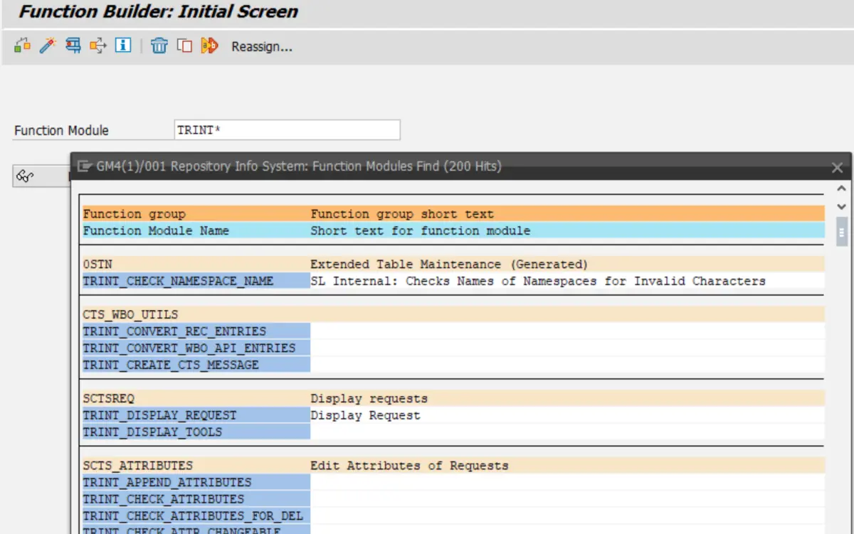 SAP 系统中的 TRINT 开头的函数是一组强大的工具,可以用来管理和操作 Transport Request。虽然 "INT" 的具体含义可能因为不同的函数和上下文而有所不同,但是我们可以大致理解为 "Interface" 或 "Internal",用来表示这些函数是内部接口。