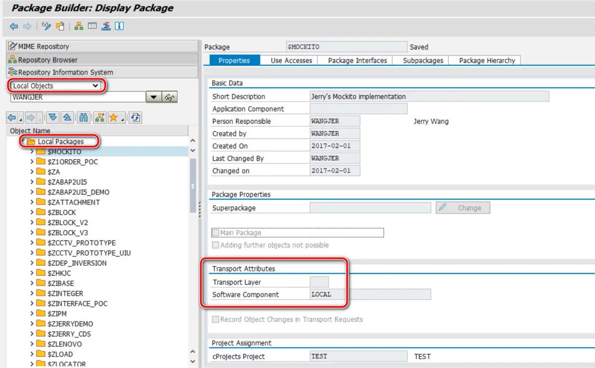 所谓本地开发包,就是指下图这些在 SE80 事务码里,显示在 Local Objects 和 Local Packages 下面,Transport Layer 为空,Software Component 为 LOCAL 的这些开发包。