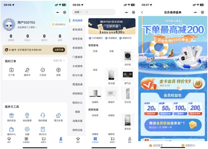 在我的订单界面,查询下单商品实时状态,包括已下单、服务中、已完成、返修、已取消等,具体直观,我的奖品,地址管理,我的客服可选择电话、维修、在线三种方式,随时解答疑惑问题,意见反馈页面,可随时发起反馈,并查看反馈记录,福利中心,签到与活动获取我的积分,利用积分可用兑换代金券,会员卡一栏,详细介绍了Z+金卡与Z+钻卡两种类型,回本券,清洗券,大额券等免费赠送,还可以享受免费服务,房屋修缮券等。个人资料,可用设置头像、昵称、性别、生日。