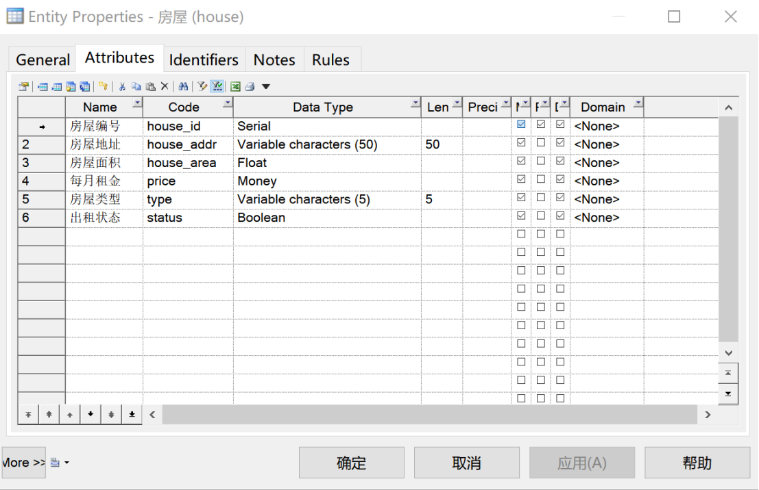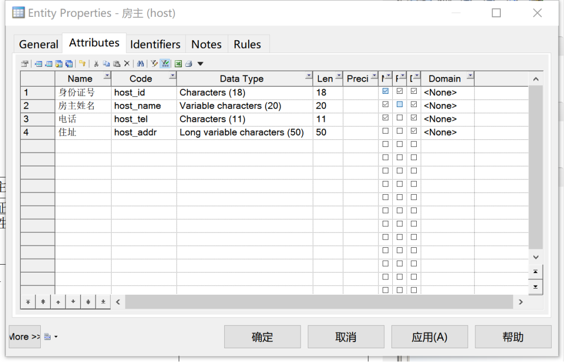 ①对“房主”实体,其基本属性包括身份证号、房主姓名、电话和住址。其中选取“身份证号”作为标识符(Primary Identifier),“身份证号”“房主姓名”“电话”设置为强制不可为空(Mandatory),如图2所示。