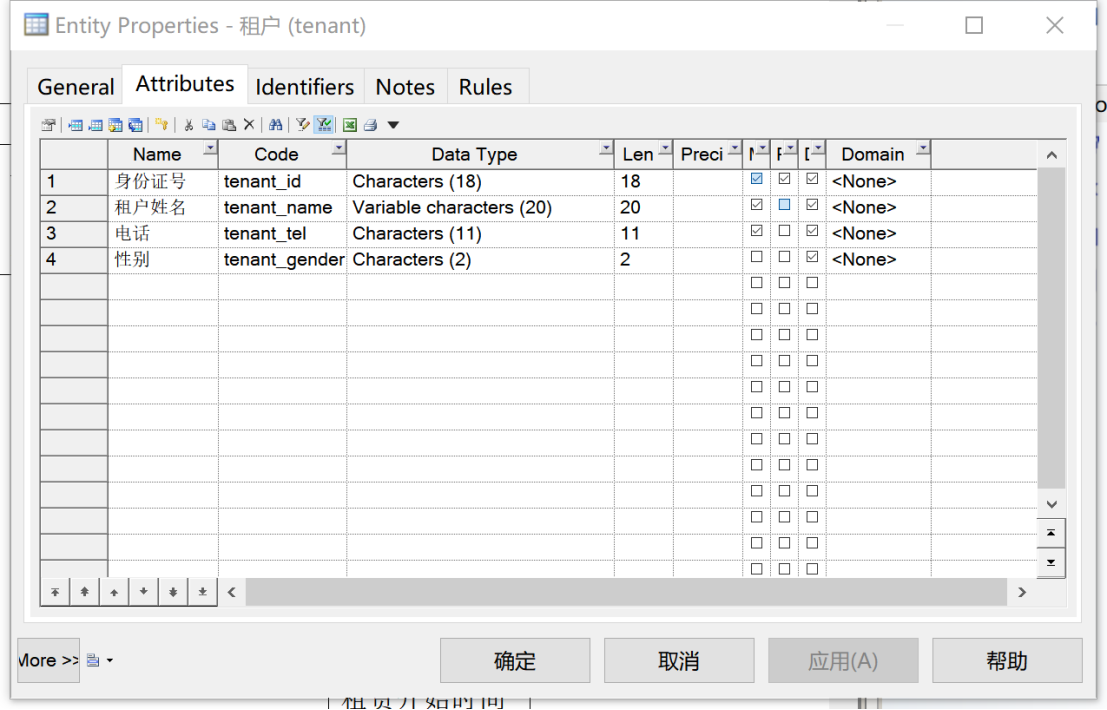 ②对“租户”实体,其基本属性包括身份证号、租户姓名、电话和性别。其中选取“身份证号”作为标识符(Primary Identifier),“身份证号”“租户姓名”“电话”设置为强制不可为空(Mandatory),如图3所示。