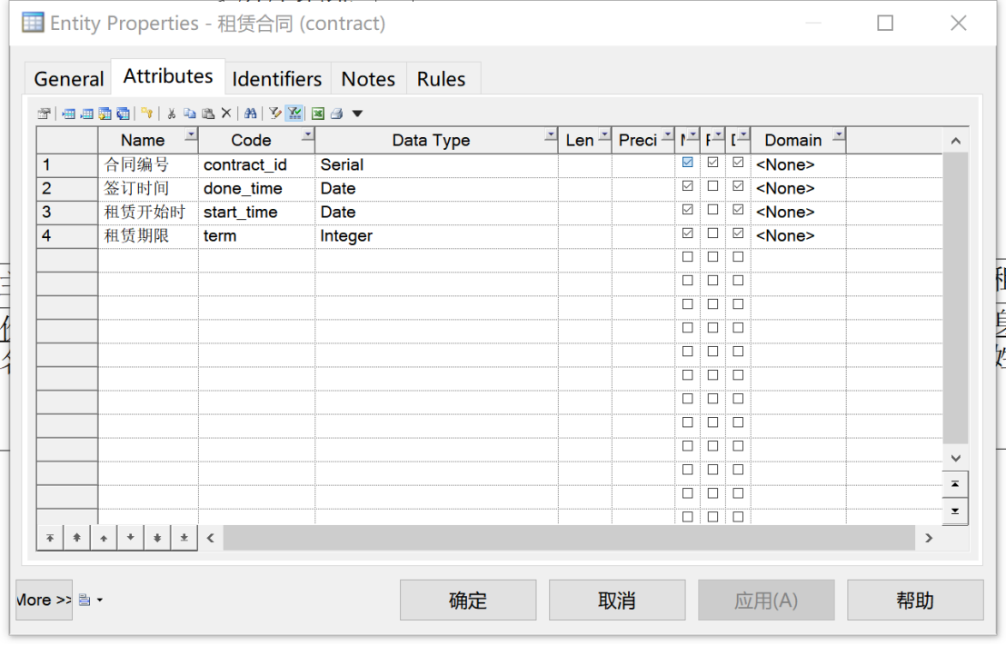 ④对“租赁合同”实体,其基本属性包括“签订时间”“租赁开始时间”“租赁期限”,均设置为Mandatory。此外,引入新的属性“合同编号”作为标识符,如图5所示。