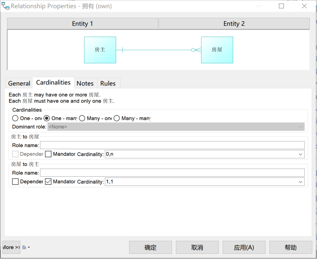 “房主”和“房屋”之间是“一对多”关系:一位房主最多拥有N套房,也可以拥有零套房;一套房一定被且只能被一位房主拥有。如图7所示,定义此“拥有”关系。