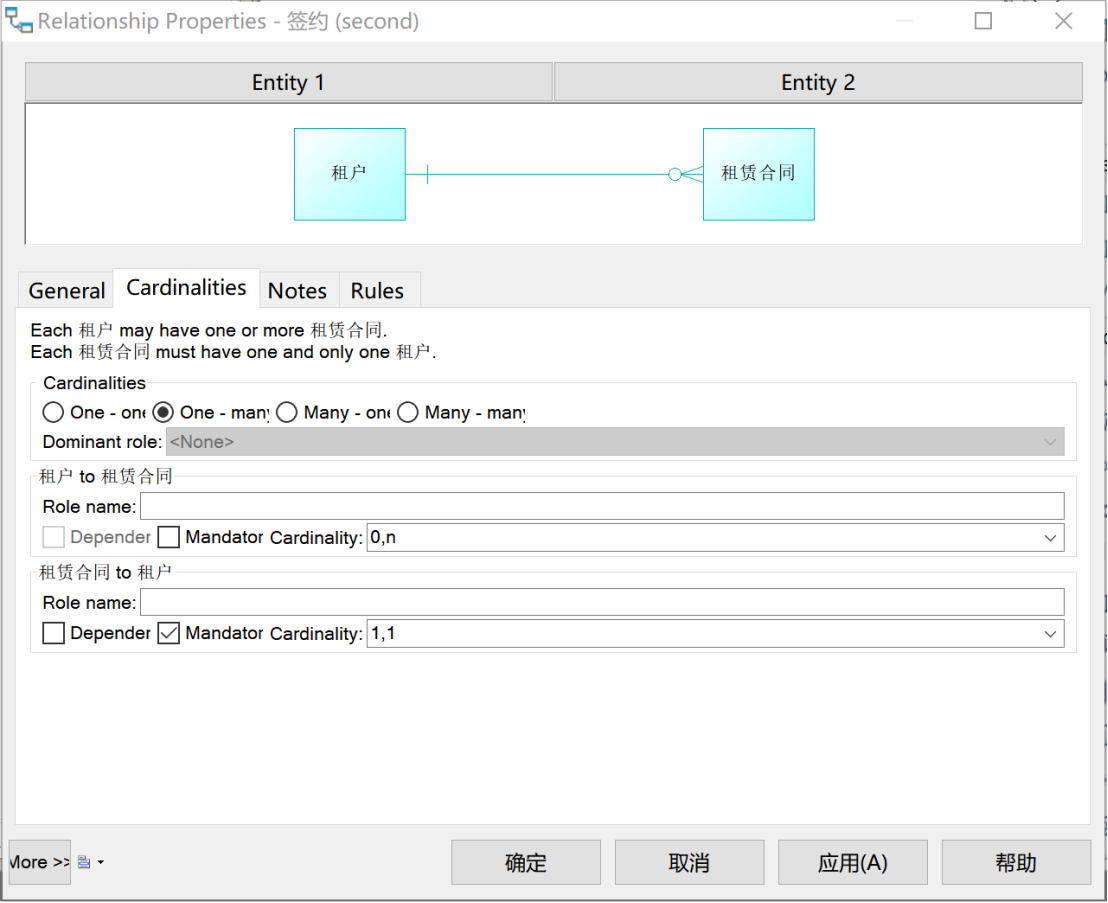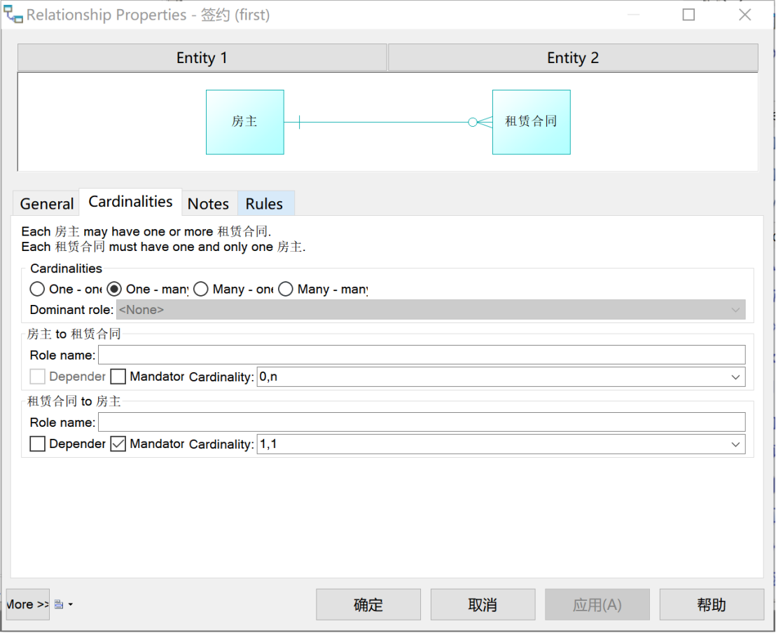 “房主”和“租赁合同”之间是“一对多”关系:一位房主最多签约N份合同,也可以不签约合同;一份租赁合同一定被且只能被一位房主签约。如图8所示,定义此“签约”关系。
