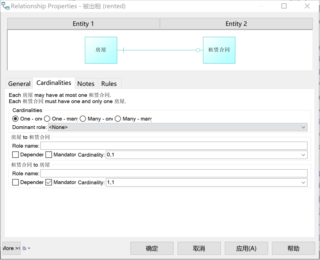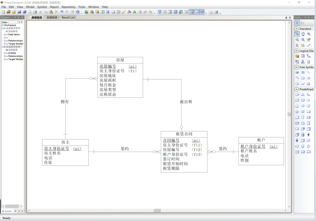 - 对于“房屋”和“租赁合同”间的关系,在一个实体中添加另一个实体的标识符做外键标识符即可。这里删除冗余的“被出租2”关系。修改完成后如图17所示。