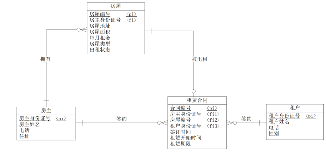 - 在概念数据模型基础上,采用关系数据库设计方式,将房屋租赁管理系统概念数据模型转换为系统逻辑数据模型设计,并进行规范化完善设计,至少满足3NF规范。