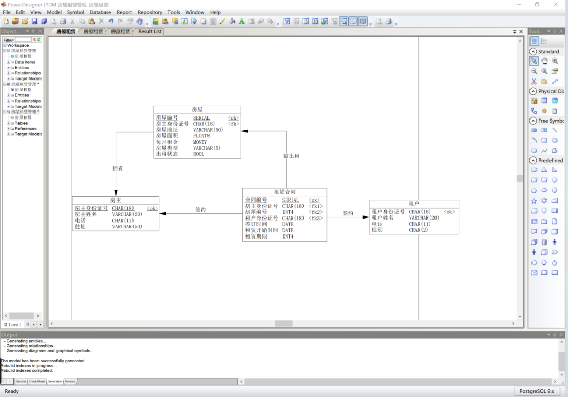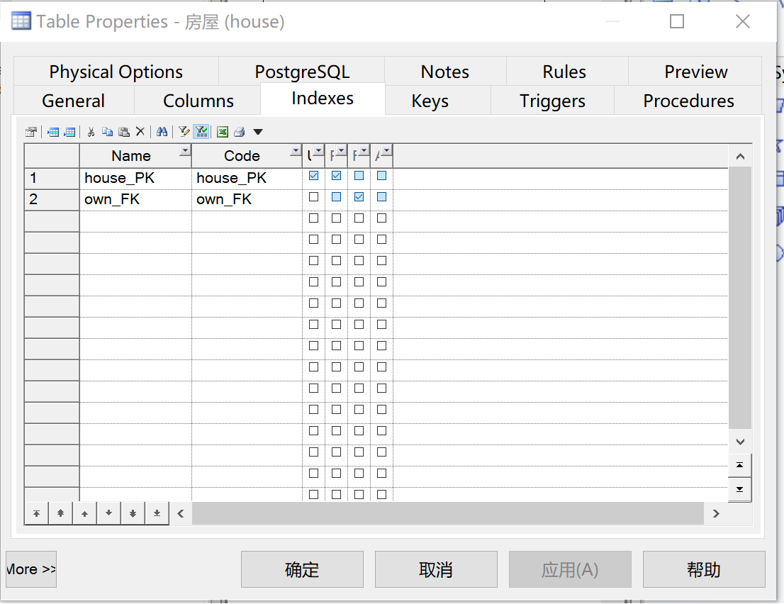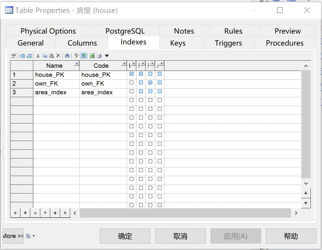 我们发现,在生成PDM时Power Designer已自动为“房屋编号”和“房主身份证号”生成索引,这样,我们在查询时就具有较高的效率。
