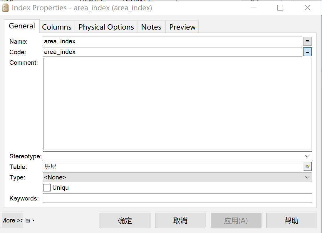 除此之外,在实际业务中,针对“房屋面积”查询的情况较多,应为其生成索引。如图22,新建一个索引。