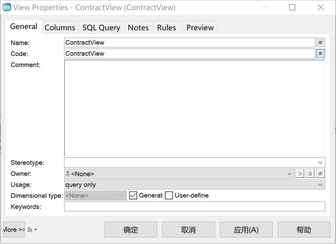 注意,Code是实际转换为数据库时的字段名,Name只是做注释用的(在转化sql时,只有Code会被应用,Name只在视图显示)。